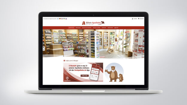 Bären Apotheke Grafing WebsiteLeistungen Logodesign, Geschäftsausstattung, Flyerdesign, Fahrzeugdesign, Gestaltung, Umsetzung und Betreuung einer Website mit Shopintegration, Gestaltung eines Maskottchens, Bedruckte Giveaways, Weihnachtskarten, Mitarbeiterfotos. www.baeren-apotheke-grafing.de Weitere Referenzen