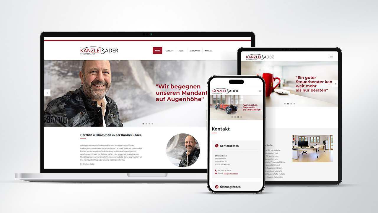 Steuerkanzlei BaderLeistungen Gestaltung und Umsetzung einer responsive Unternehmens-Website. www.stk-bader.de Referenzen ÜbersichtWeitere Referenzen Bären Apotheke Grafing Website Steuerkanzlei Bader Stiftung Sonnenseite Website Heigenmoser Elektroanlagen Website Charity Weintasting Website Lernpraxis Website Café am Gröbenbach Zahnarztpraxis Lehberger Website Ferienwohnungen Heilinglechner Sprachtherapie Hohenlinden Search Funds Personal International Metin Mitchell & Company Markus Kästle Website Marco Schulz Website Geneva Consulting & Management